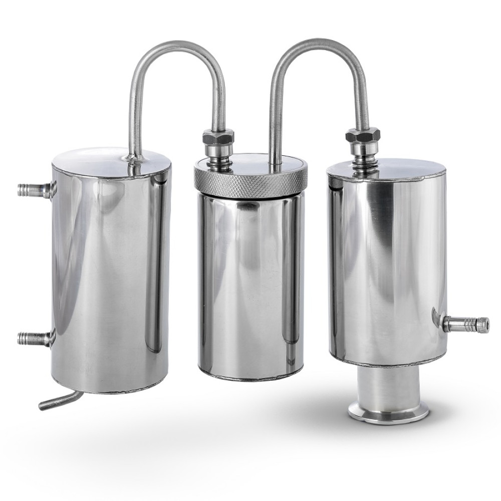 The first dry-cell separates the largest amount of impurities, so they can be drained directly during the distillation process due to the installed tap. The second dried-up barrel is demountable, it can be used for aromatization of the final product. Inside, you can place any aromatic components (citrus peel, herbs, fruits), they will enrich the passing through them of alcohol vapor with a light aroma.