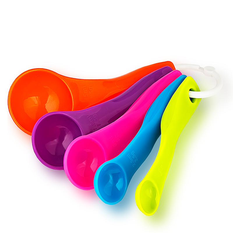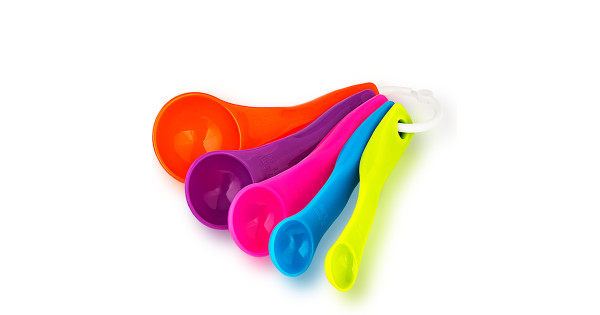 A set of multi-colored measuring spoons made of plastic. A set of measuring spoons is a kitchen accessory that will be useful to every hostess. Measuring spoons will help measure the right amount of ingredients in canning and preparing homemade dishe..