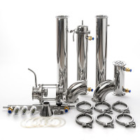A powerful 3-inch shell-and-tube cooler with a length of 40 cm, inside of which there are 12 tubes with a bore diameter of 10 mm, makes it possible to utilize up to 10 kW of supplied heating power per distillation cube with relatively small volumes of water consumption (depending on the temperature of the supplied water). A diopter with a built-in liquid take-off unit allows the user to set the column to a “pre-flooded” state, which will increase the separating ability of the column, which will allow 96.6% alcohol to be removed at high speed. The combination of liquid take off and 2-in-1 diopter simplifies column assembly and reduces the number of fittings. The jacket-type aftercooler has a diameter of 25 mm and a length of 350 mm, which indicates its high performance. For operation in potstill and distillation modes, two 90-degree outlets have been added to this package, one of which has a fitting for a thermometer, a powerful 3-inch shell-and-tube reflux condenser 20 cm long, inside which there are 12 tubes with a through diameter of 10 mm.