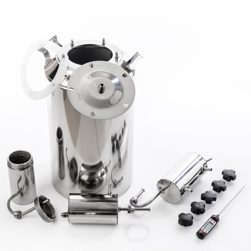Wide throat 110 mm, completely flat bottom and the compact design of polished stainless steel with two steam drum will allow you just one hour to prepare a large amount of high-end alcohol, which you will be able to treat all of their loved ones. Easy-to-use large throat of 110 mm makes it possible to experiment with recipes. Download all the ingredients and create a unique spirits of the highest quality!