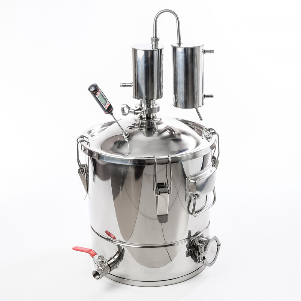 Tags: home-brewed device, distiller, premium, 20 liters, mouth 300 mm, with thermometer, clamp